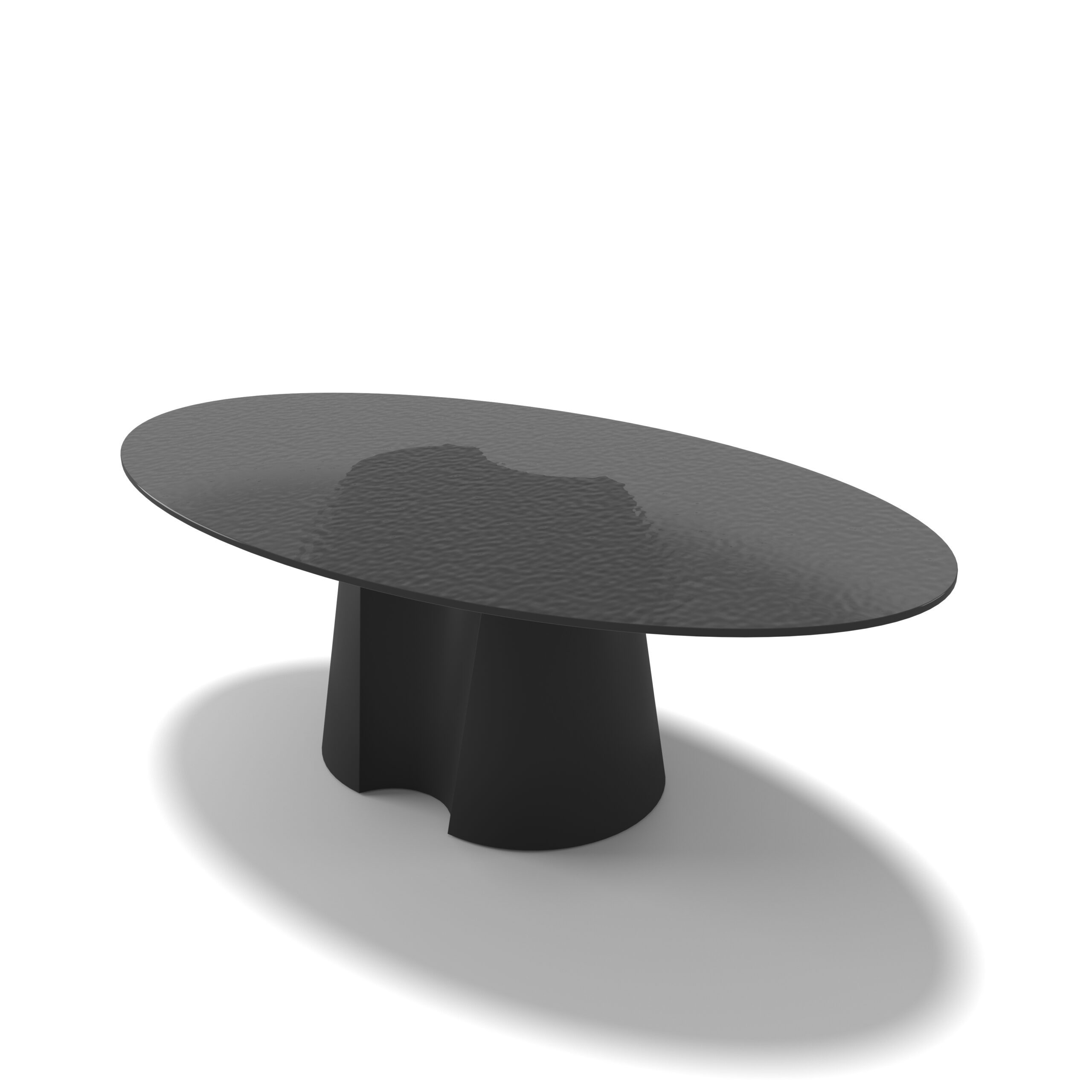 Introducing Nara, a oval shaped coffee table featuring a glass top with a captivating bubble design and a powder-coated metal base.