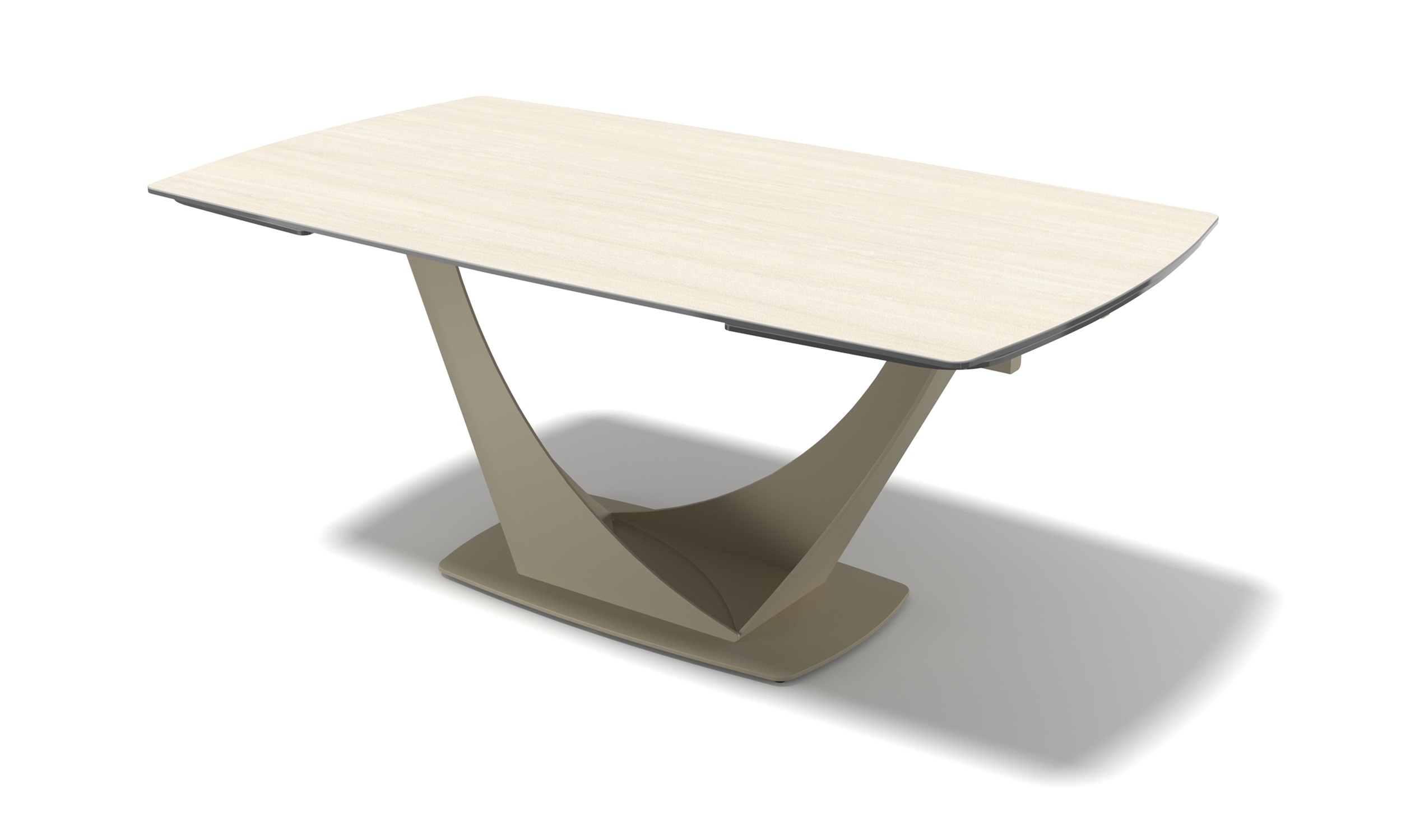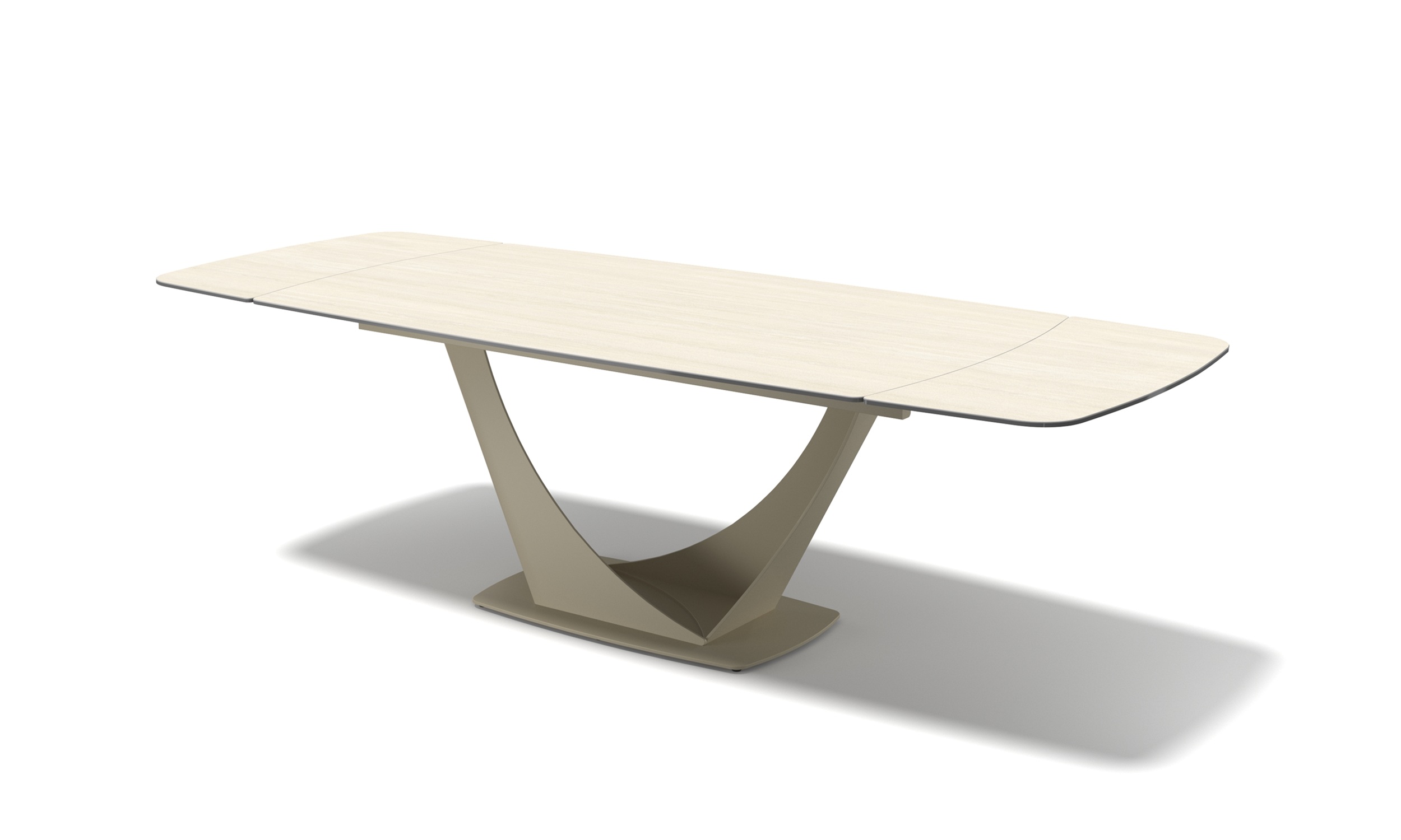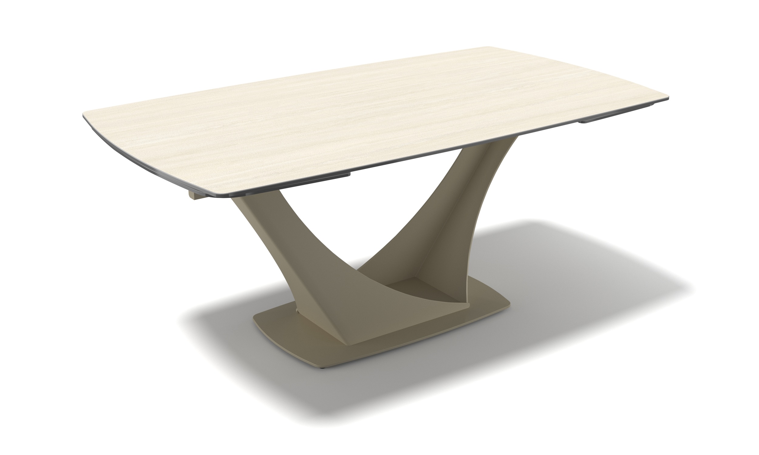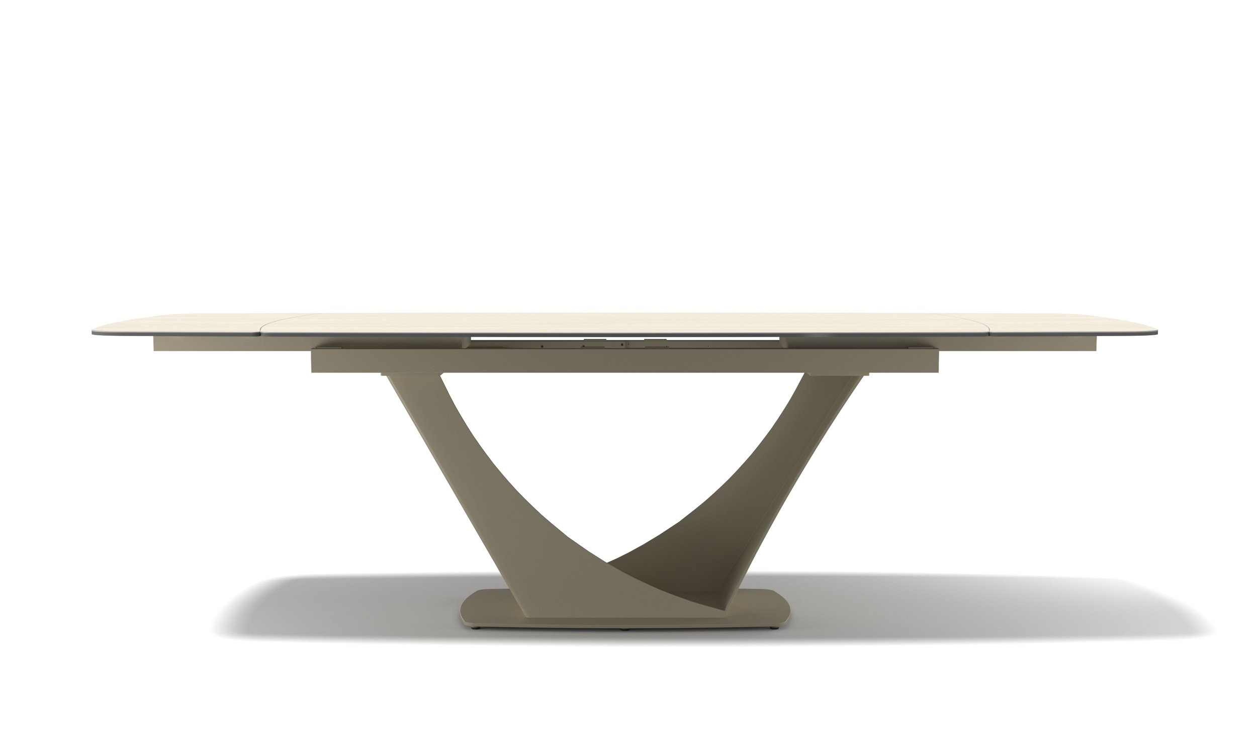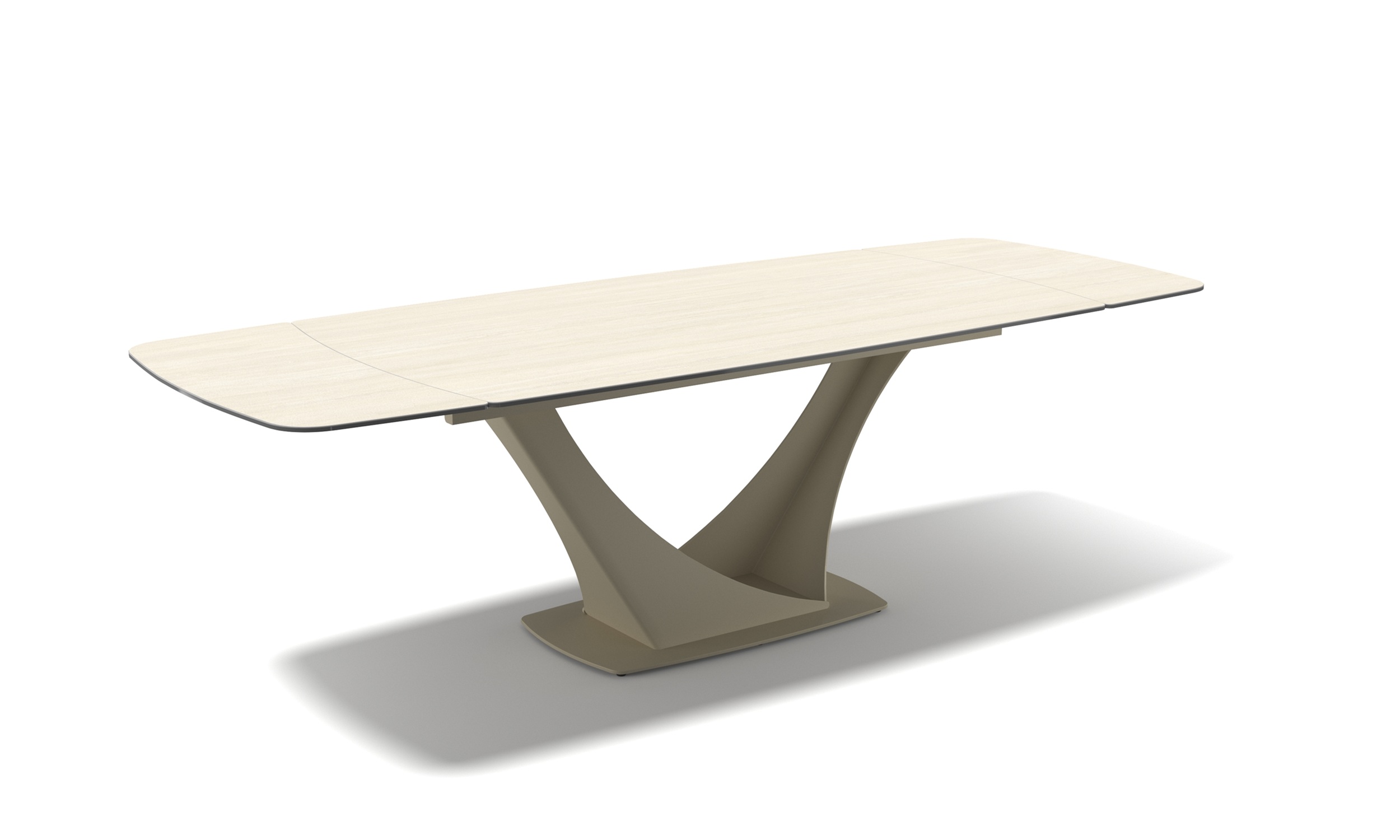 Naru is defined by its sculptural pedestal base, forming a striking architectural arc beneath a spacious tabletop. The soft-edged rectangular surface and champagne-toned finish add warmth and elegance to its bold geometry. Designed for statement-making interiors, it brings balance, function, and sophistication to modern dining settings.
